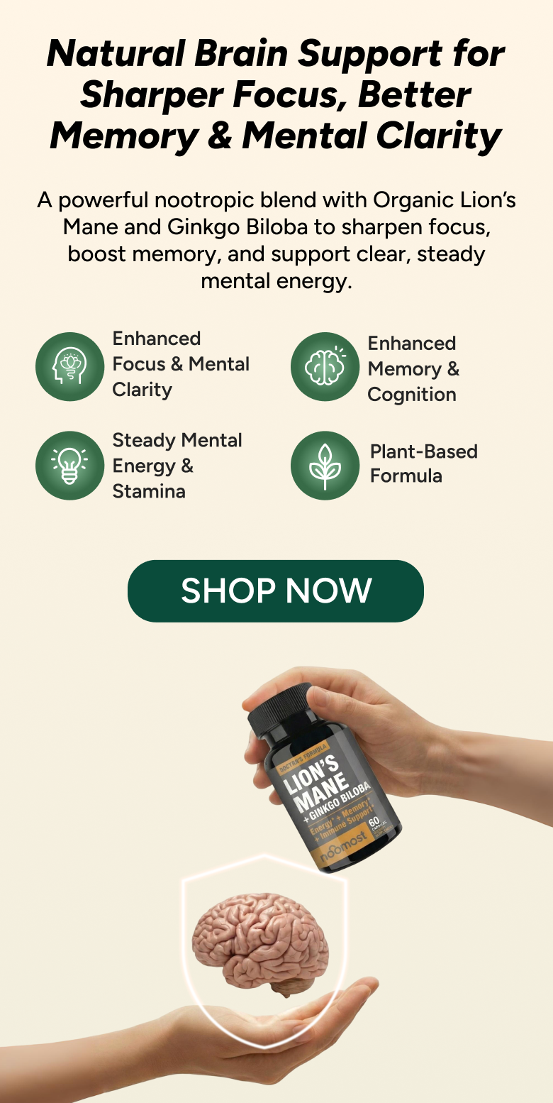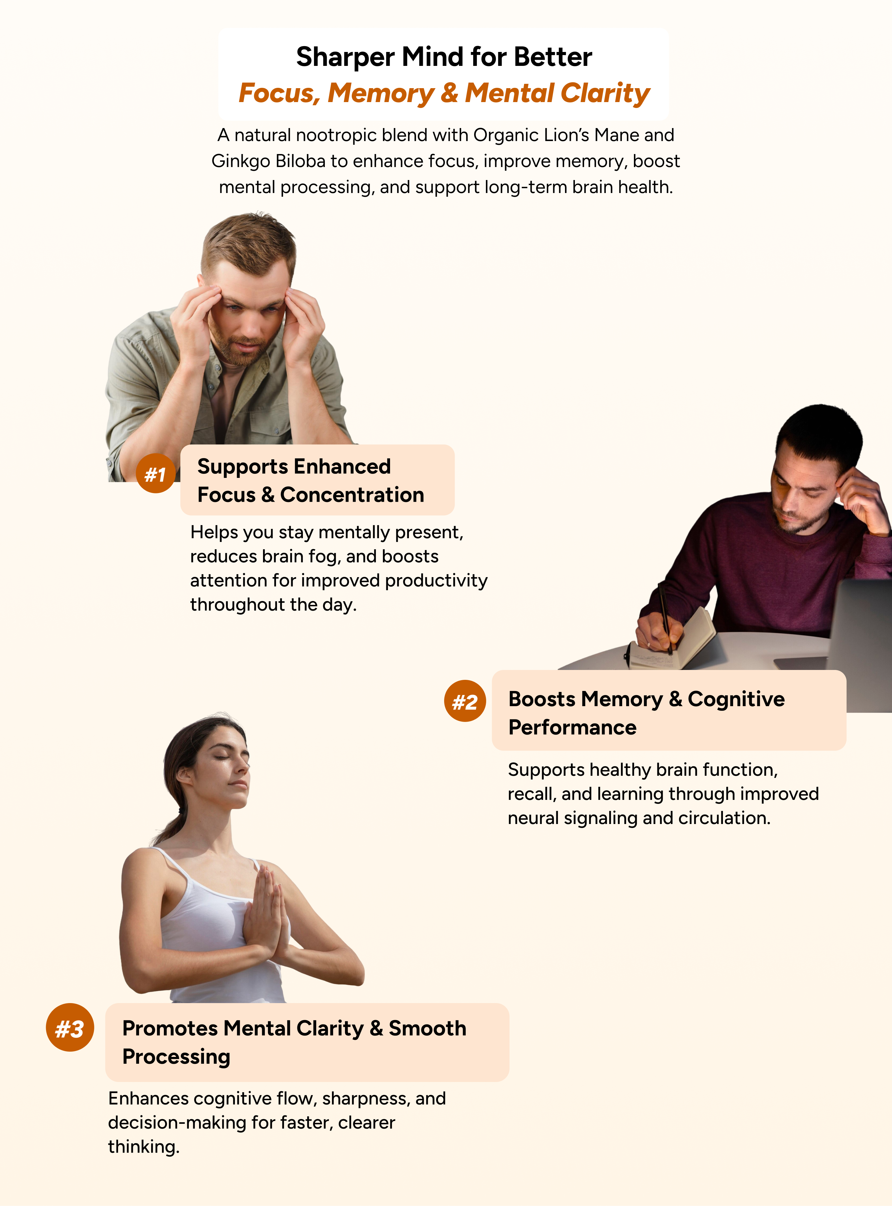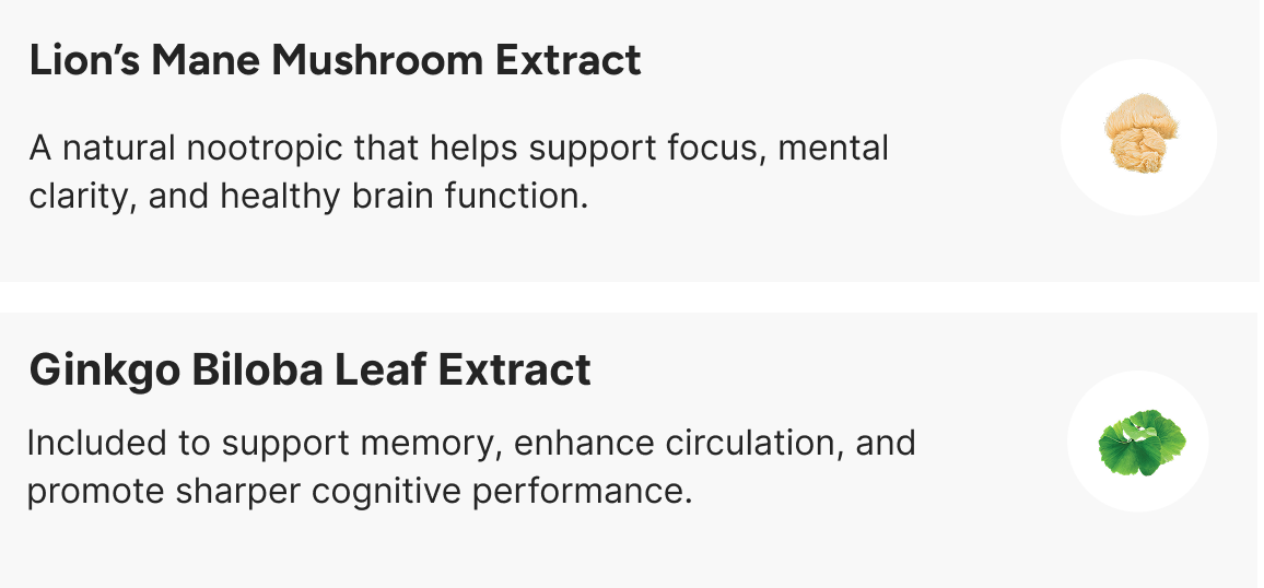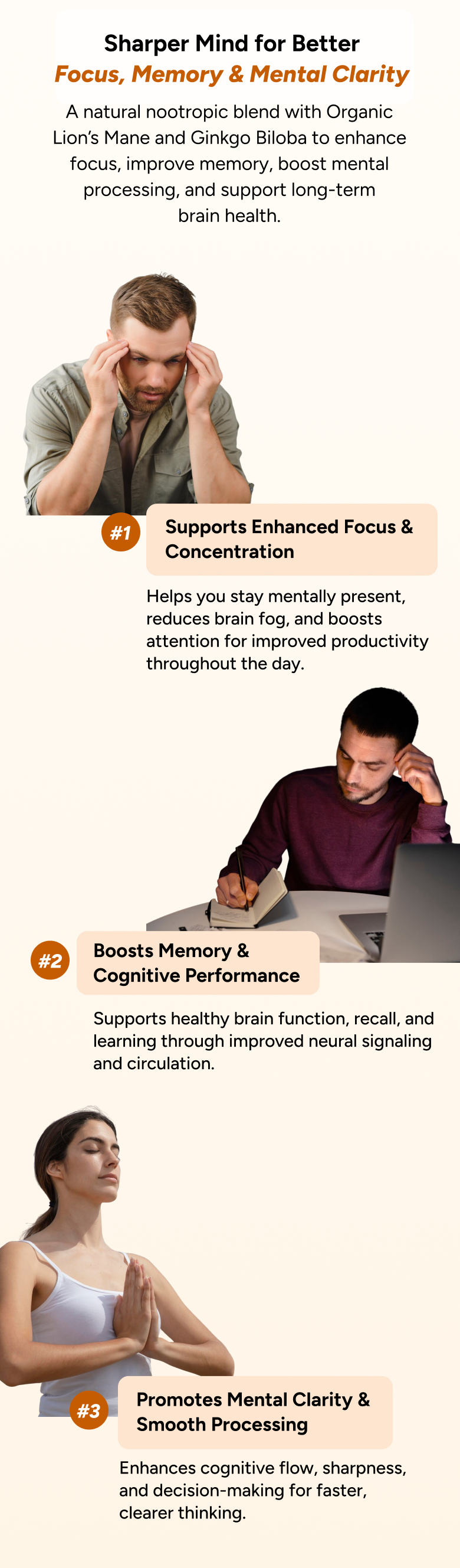 Lion’s Mane supports neural health and clarity, while Ginkgo Biloba improves blood circulation in brain to enhance memory and cognitive performance.